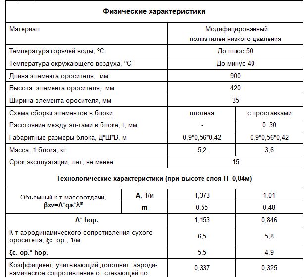 Ороситель марки ОС ПНД является улучшенной модификацией оросителя немецкой фирмы Бальке-Дюрр. Элемент оросителя имеет вид сетчатого гофрированного листа со стяжками по краям (для придания ему дополнительной жесткости). Поставка оросителя производится в виде готовых к монтажу блоков. В зависимости от реальных условий эксплуатации, элементы собираются в блоки по различным схемам: